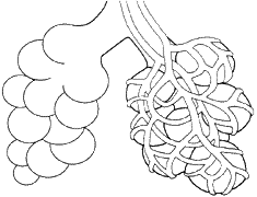 Das mit Kohlenstoffdioxid angereicherte Blut verteilt sich über die große Lungenschlagader Truncus pulmonalis aus der rechten Herzkammer in die beiden Lungenarterien. Jede führt zu einem Lungenflügel und bildet bei den Lungenbläschen ein feines Kapillarnetz. Das Kohlenstoffdioxid wird abgegeben, und Sauerstoff wird in den Blutkreislauf aufgenommen. Die ganz feinen Blutgefäße an den Lungenbläschen werden auch Lungenvenolen und Lungenarteriolen genannt.