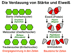 Der Nahrungsbrei gelangt vom Magen über den Magenpförtner in den ersten Teil des Dünndarms, der als Zwölffingerdarm (Duodenum) bezeichnet wird. Die Gänge der Leber und der Bauchspeicheldrüse münden in diesen Abschnitt. Dort werden die Amylasen aus der Bauchspeicheldrüse aktiv und spalten die schon im Mundspeichel entstandenen Dextrine zu Zweifachzuckern wie Maltose. Der Gallensaft aus der Leber zerteilt die Fette zu feinen Tröpfchen, so dass die Fette auf dem nachfolgenden Weg durch das Enzym Lipase zu Fettsäure und Glycerin zerlegt werden können. Die Bauchspeicheldrüse liefert den Bauchspeichel mit mehreren Enzymen, sowie Natriumbicarbonat zum Neutralisieren der Salzsäure aus dem Magen. Die Drüsen des Dünndarmes sondern weitere Enzyme ab. Dazu zählen die Maltase, die Maltose zu Glucose zerlegen kann, oder Peptidasen. Zu diesen gehört auch das Trypsin aus der Bauchspeicheldrüse, es wird aber erst durch weitere Peptidasen aus den Dünndarmdrüsen aktiviert. Die Enzyme wirken im Dünndarm etwas vereinfacht dargestellt so: