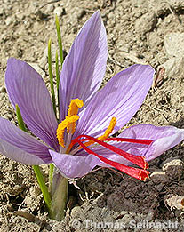 Echter Safran wird oft auch als Safran-Krokus oder verkürzt als „Safran“ bezeichnet. So wird aber nicht nur die Pflanze, sondern auch das daraus hergestellte Handelsprodukt mit den getrockneten Narben benannt. Der Safran-Krokus kann sich nicht geschlechtlich fortpflanzen, die Vermehrung erfolgt ausschließlich vegetativ durch Teilung der Knollen, die sich im Boden befinden. In dieser Knolle verbleibt die Pflanze im Winter, im Frühling und im Sommer. Die Knolle treibt erst im Herbst, wenn die ersten, kälteren Tage spürbar sind. Die sechs hellvioletten Blütenblätter sind am Grund zu einer Röhre verwachsen. In der Blüte entwickeln sich drei gelbe Staubblätter und drei Griffel. Aus den Griffeln hängen die roten, bis zu zwei Zentimeter langen Narben heraus. Diese teilen sich in mehrere Narbenäste, die am Ende keulenartig verdickt sind. Die grünen Laubblätter wachsen grundständig und sehen aus wie ein Gras.
