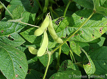 Die in Ostasien beheimatete Sojabohne ist eine der bedeutendste Nahrungsflanzen der Welt. Die Samen enthalten nicht nur Eiweiß, sondern sie sind auch reich an Kohlenhydraten und fetten Ölen. Die einjährige Pflanze wird nicht nur in Ostasien, sondern auch in Nordamerika und in Osteuropa kultiviert. Die Ernte erfolgt, wenn die Blätter gelb werden. Die Hülsen werden etwa drei bis acht Zentimeter lang und enthalten bis zu fünf gelbbraune, grünliche oder schwarzviolette Samen. Das daraus gewonnene Sojaöl dient zur Herstellung von Margarine. Sojamehl wird in Brot verarbeitet, Sojaflocken in Müsli. Zusammen mit Mais und Reis werden die Samen als Gemüse gegessen. Durch Einweichen und Zermatschen der Samen in Wasser erhält man Sojamilch. Der daraus gewonnene Quark ist unter dem Namen Tofu bekannt. Dieser ist besonders bei Vegetariern beliebt.