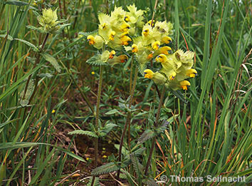 Die violetten Zähnchen der Oberlippe gelten als Saftmale. Diese leiten die langrüsseligen Bestäuber wie Hummeln, Bienen oder Schmetterlinge zum Nektar. Der Pollen wird auch durch den Wind verstreut. Der breite Kelch bietet zur Fruchtzeit Angriffsfläche für den Wind. Die reifen Samen klappern in der Frucht, wenn der Wind darüber streicht oder wenn man diese schüttelt. Dieses Phänomen ist wie die zottige Behaarung für die Pflanze namensgebend. Die Flügel am Samen ermöglichen einen Segelflug. Der Klappertopf gilt als Halbschmarotzer, weil er sich an Süßgräsern anlehnt und diesen mit seinen kleinen Saugfortsätzen Nährstoffe entzieht. Dadurch kann das Gras sogar absterben.