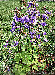 Die Glockenblume wird von Insekten wie Bienen und Hummeln besucht. Sie benutzen den herausstehenden Griffel zum Festhalten und Klettern. Dann müssen sie die verbreiterten Staubblätter wegdrücken, damit sie an den Nektar am Grund der Blüte gelangen. Die leichten Samen werden über den Wind verbreitet. Die Farbe der Glockenblume variiert von blau über blauviolett bis rotviolett, es hängt vom pH-Wert des Bodens ab: Je saurer der Boden ist, um so roter erscheint die Blüte. In den Gärten finden sich auch weiße Zuchtformen.