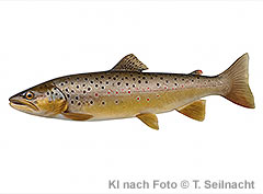 Die Bachforelle ist an der Seite dunkler als die Regenbogenforelle gefärbt. Sie bevorzugt klare, kalte Fließgewässer und benötigt einen hohen Sauerstoffgehalt und absolut saubere Gewässer. Bachforellen sind Winterlaicher und pflanzen sich zwischen Oktober und Januar fort. Das Weibchen schlägt mit ihrem Schwanz eine bis zu 30 cm tiefe Laichgrube. Die klebrigen Eier werden nach dem Ablaichen vom Männchen besamt und mit Kies bedeckt. Jüngere Tiere ernähren sich von Insektenlarven und Bachflohkrebsen, während erwachsene Bachforellen auch Kleinfische, Laich und sogar Amphibien fressen.