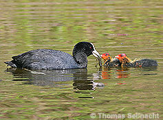 Blässhuhn beim Füttern mit fünf Jungen.